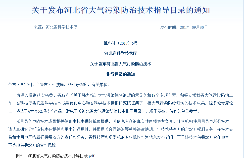 近日,河北省科學(xué)技術(shù)廳委托省科學(xué)技術(shù)成果轉(zhuǎn)化中心和省科學(xué)技術(shù)情報研究院征集了一批大氣污染防治領(lǐng)域的技術(shù)成果,經(jīng)多輪專家論證,遴選了6大類52項(xiàng)技術(shù)產(chǎn)品,形成了《河北省大氣污染防治技術(shù)指導(dǎo)目錄》,園區(qū)企業(yè)河北唯沃環(huán)境工程科技有限公司榮幸入選。